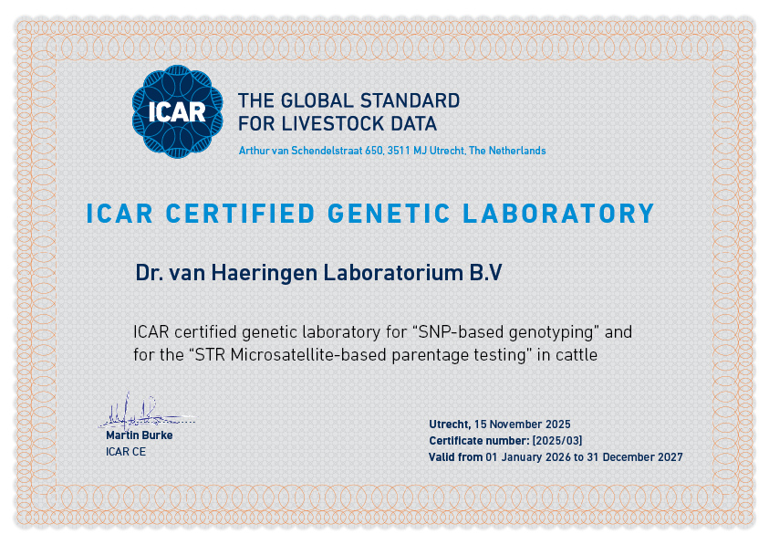 The certificate is valid for the DNA analysis of animal and plant material, parentage analysis and investigation into hereditary characteristics. For VHL, analysis into pathogens is also applicable. The certificate is registered under number NL10/81826438.